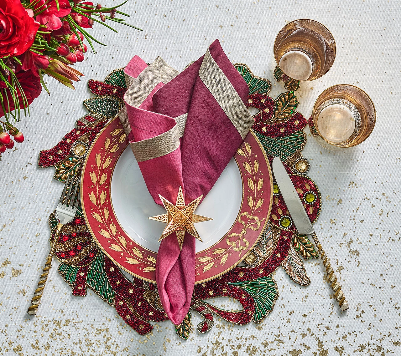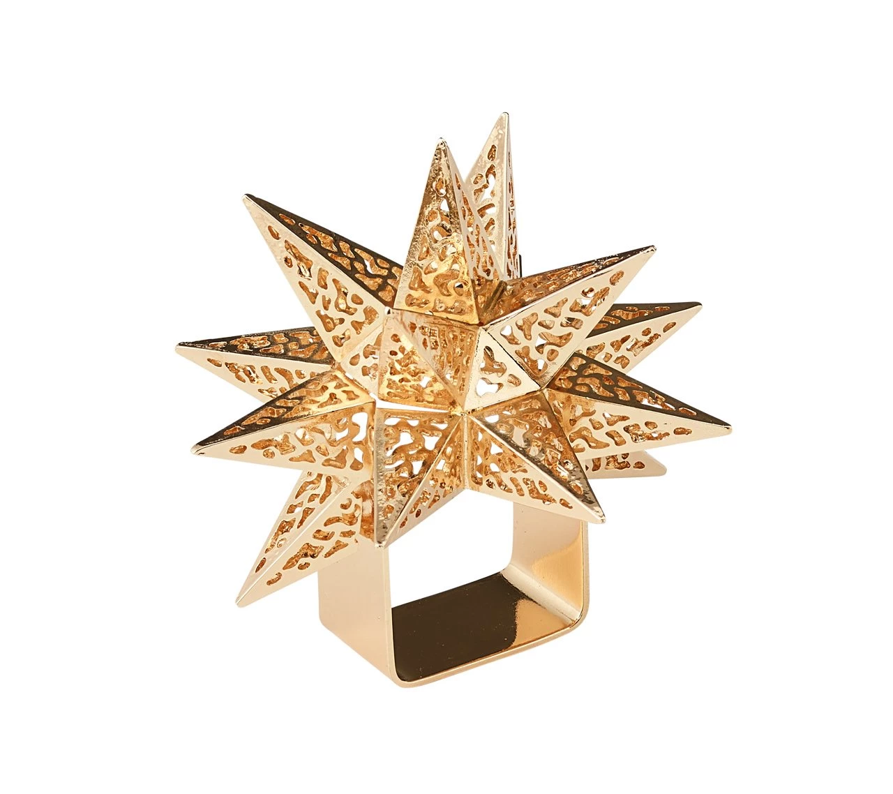 True to its name, the Stardust Napkin Ring imitates refractory dust grains emitted from cooling stars. The cast, three-dimensional gold Stardust Napkin Ring features delicate filigree. This intergalactic festive napkin ring will make the holiday table shine.