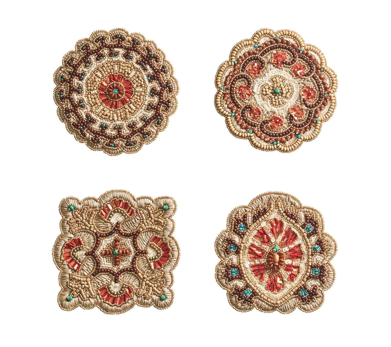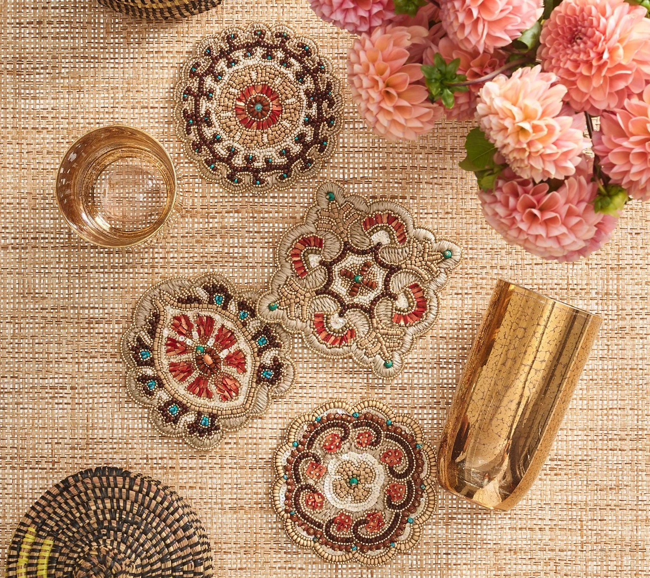 Inspired by intricately detailed Suzani fabrics, the hand-beaded Suzani Drink Coasters feature 10-20 different beads made from wood, raffia and sequins in autumnal shades. Add a bit of unexpected element of glamour with these unique beaded drink coasters.