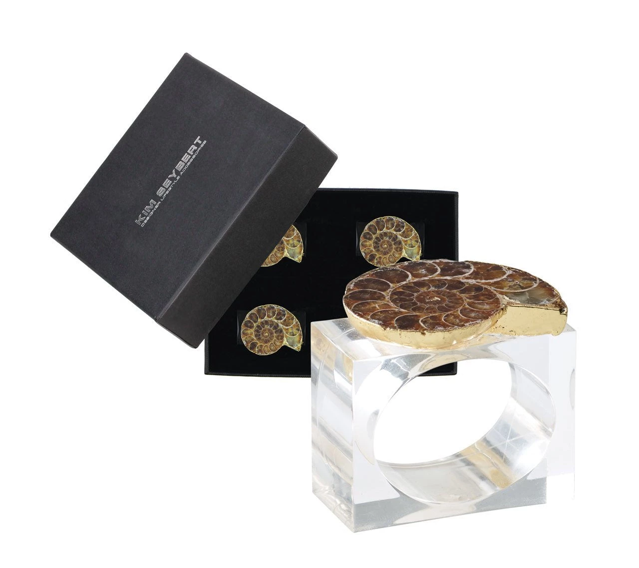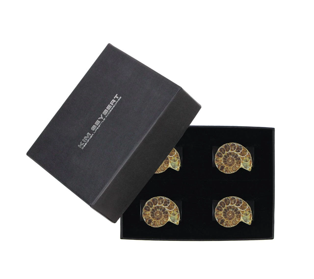 An image of a slice of fossilized mineral is mounted on a lucite block for a contemporary beach feel. It comes as a set of 4 in a Kim Seybert gift box.