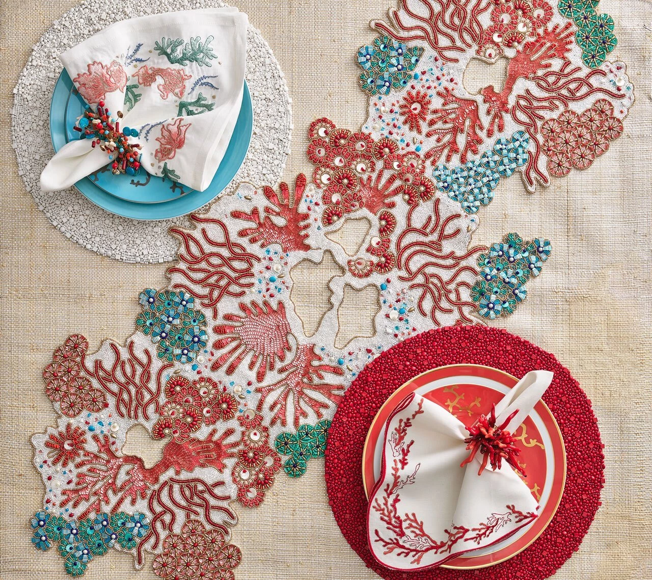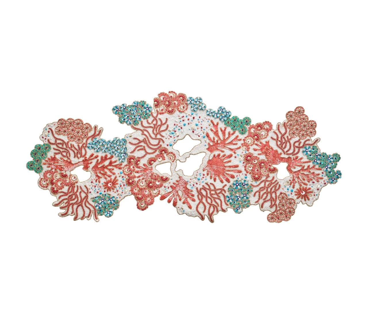 The hand-beaded Cozumel Table Runner features over 20 different beads, sequins and shells in brilliant blues, vibrant corals and shimmering golds. Coral clusters, imaginative marine plants and intricate beading weave an abstract aquatic thread throughout the beaded Cozumel Table Runner.
