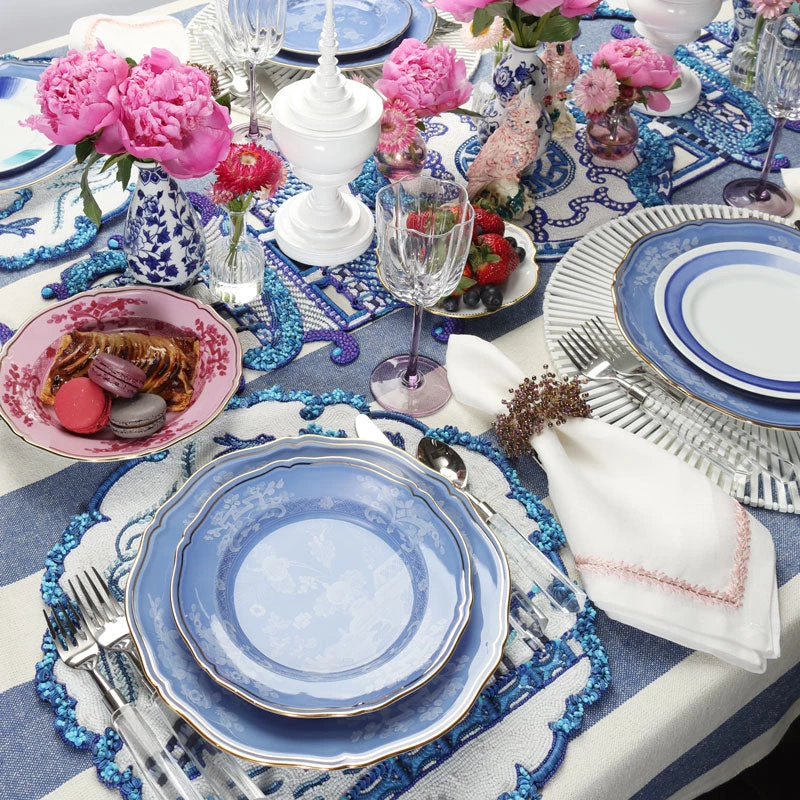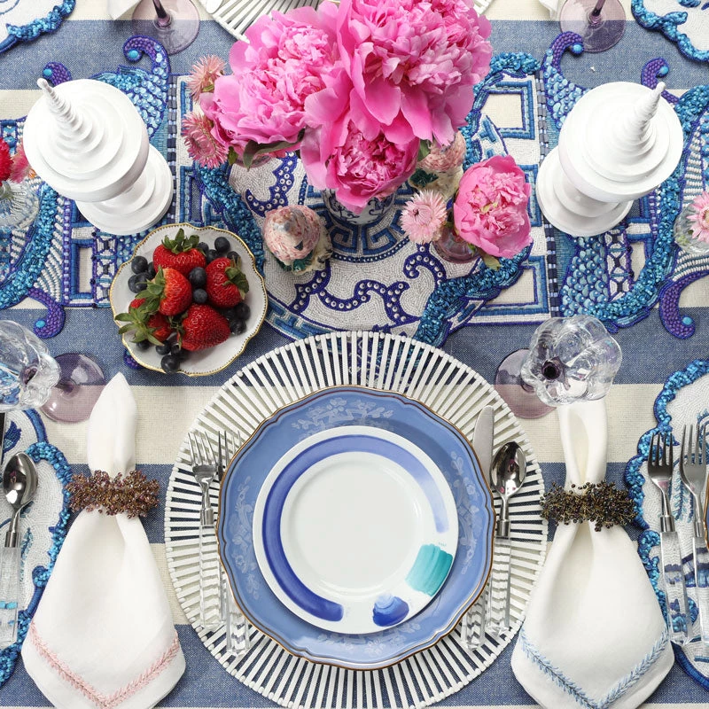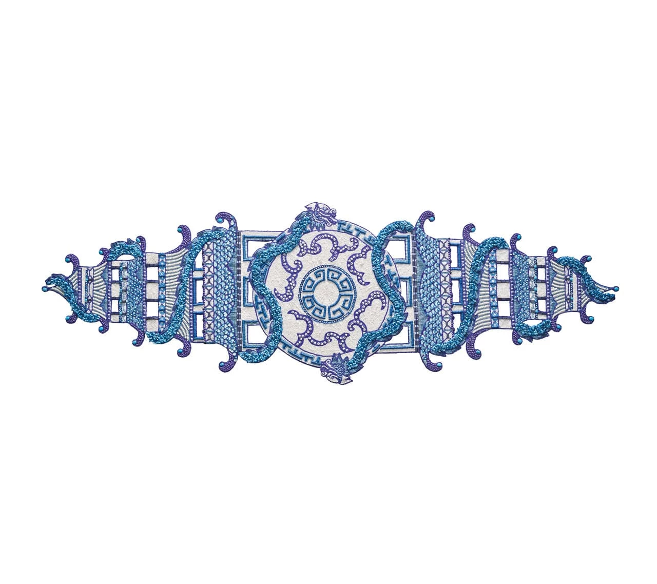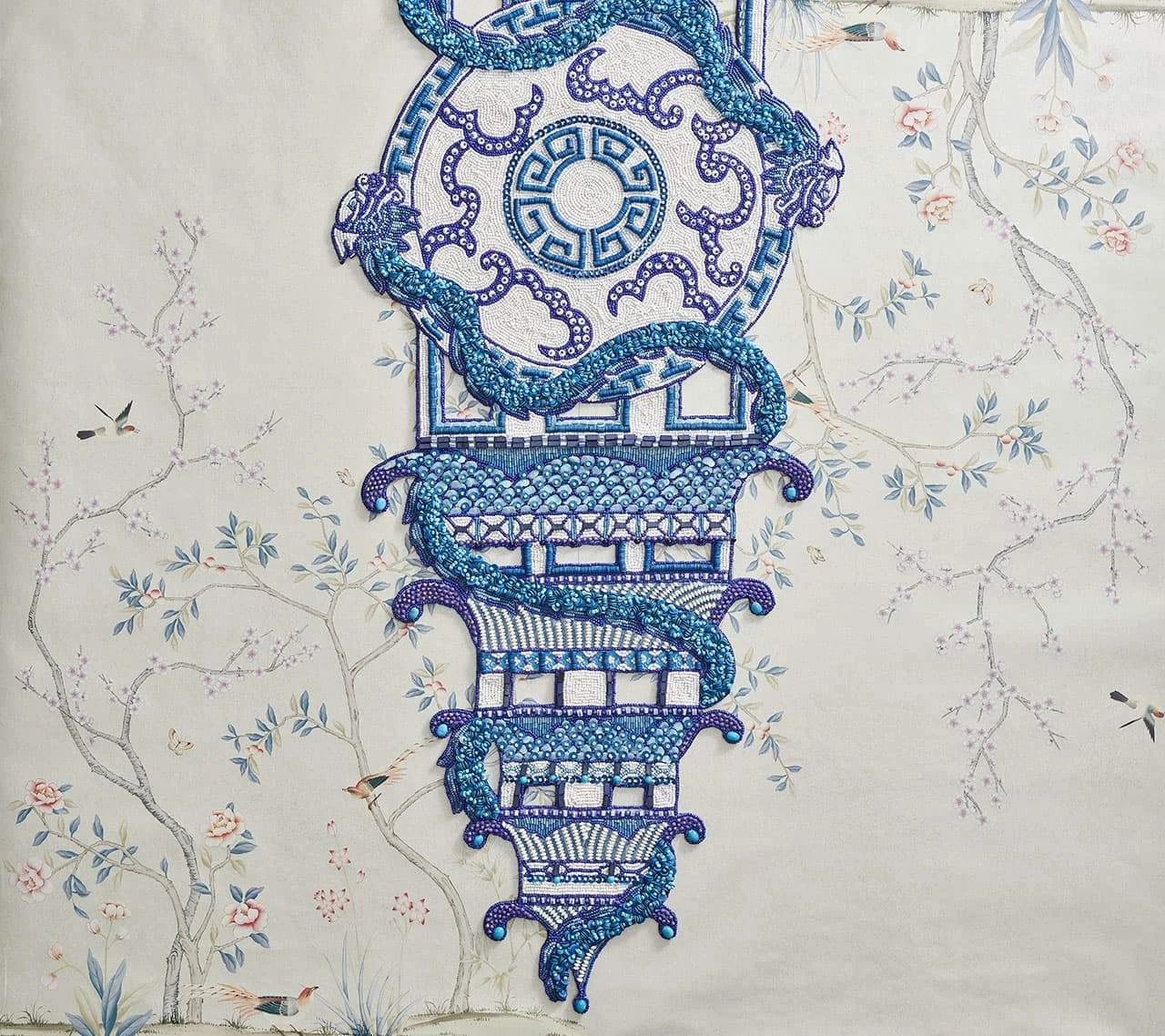 A modern take on Asian Toile, this beaded Toile Table Runner follows the classic, single-color design standard. The beaded Toile Table Runner features a three-dimensional hand-beading technique using 15-20 different types of beads and sequins. The level of detail on the stacked pagodas and interweaving dragon is exceptional.