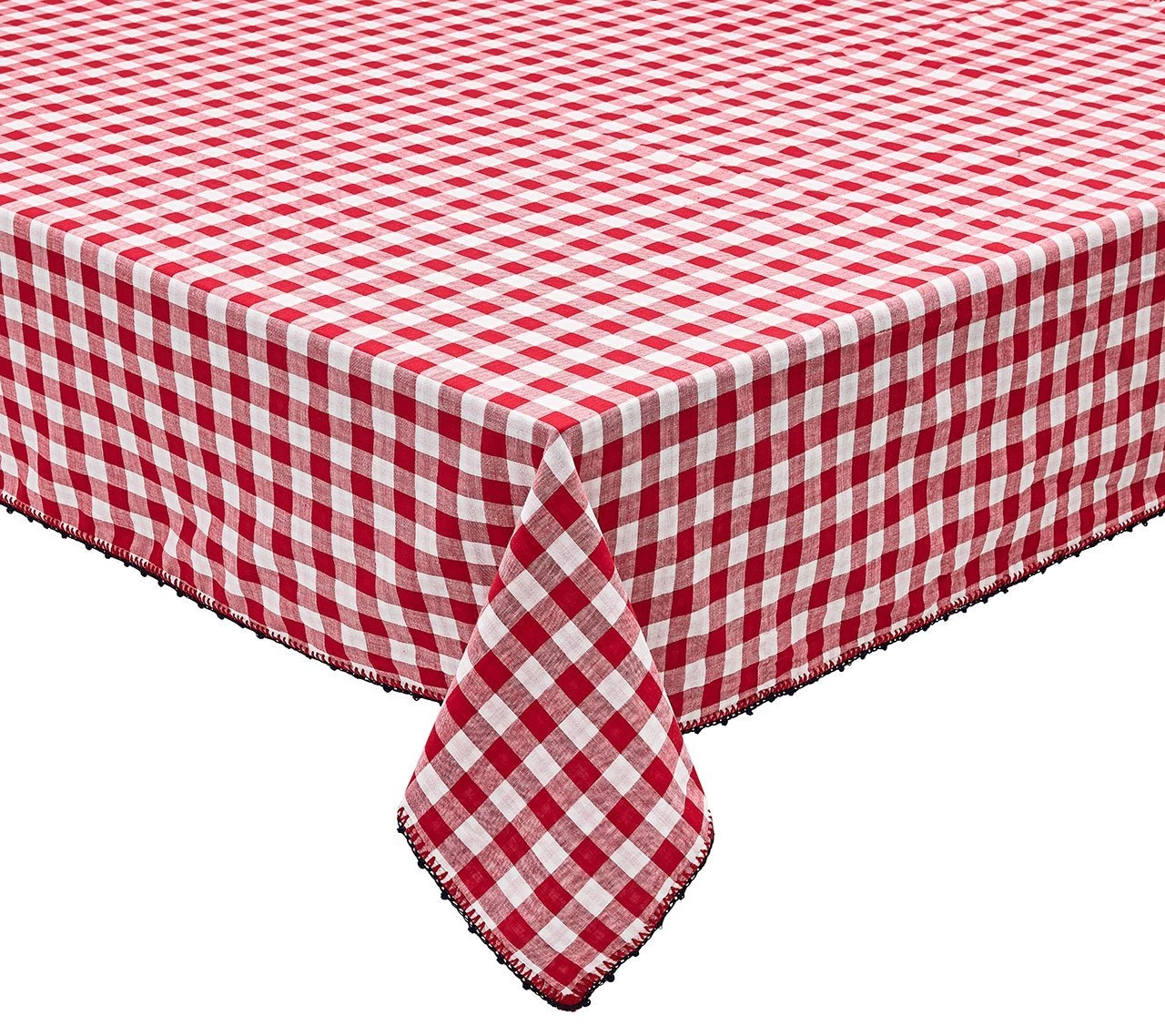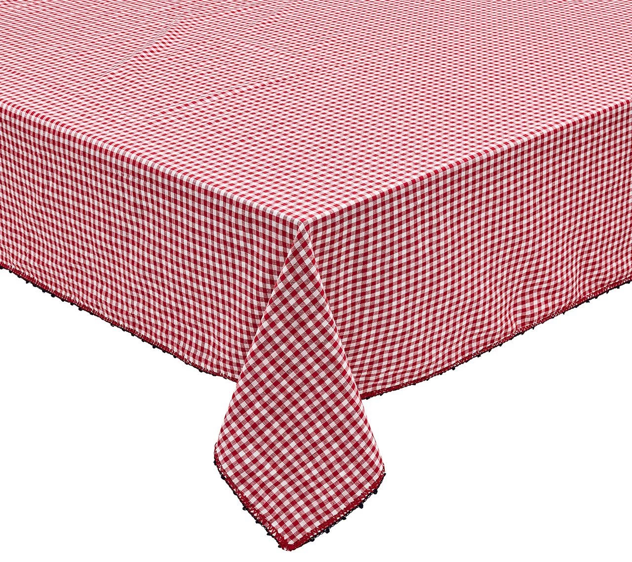 The cotton Check Tablecloth features a red checkered pattern on white cotton fabric. The double-layered cotton fabric allows the red checkered pattern to show on both sides. The delicate deep navy crochet edge detail of the tablecloth accents the bold red print. This cheerful cotton tablecloth is perfect for a summer picnic or a seaside brunch.