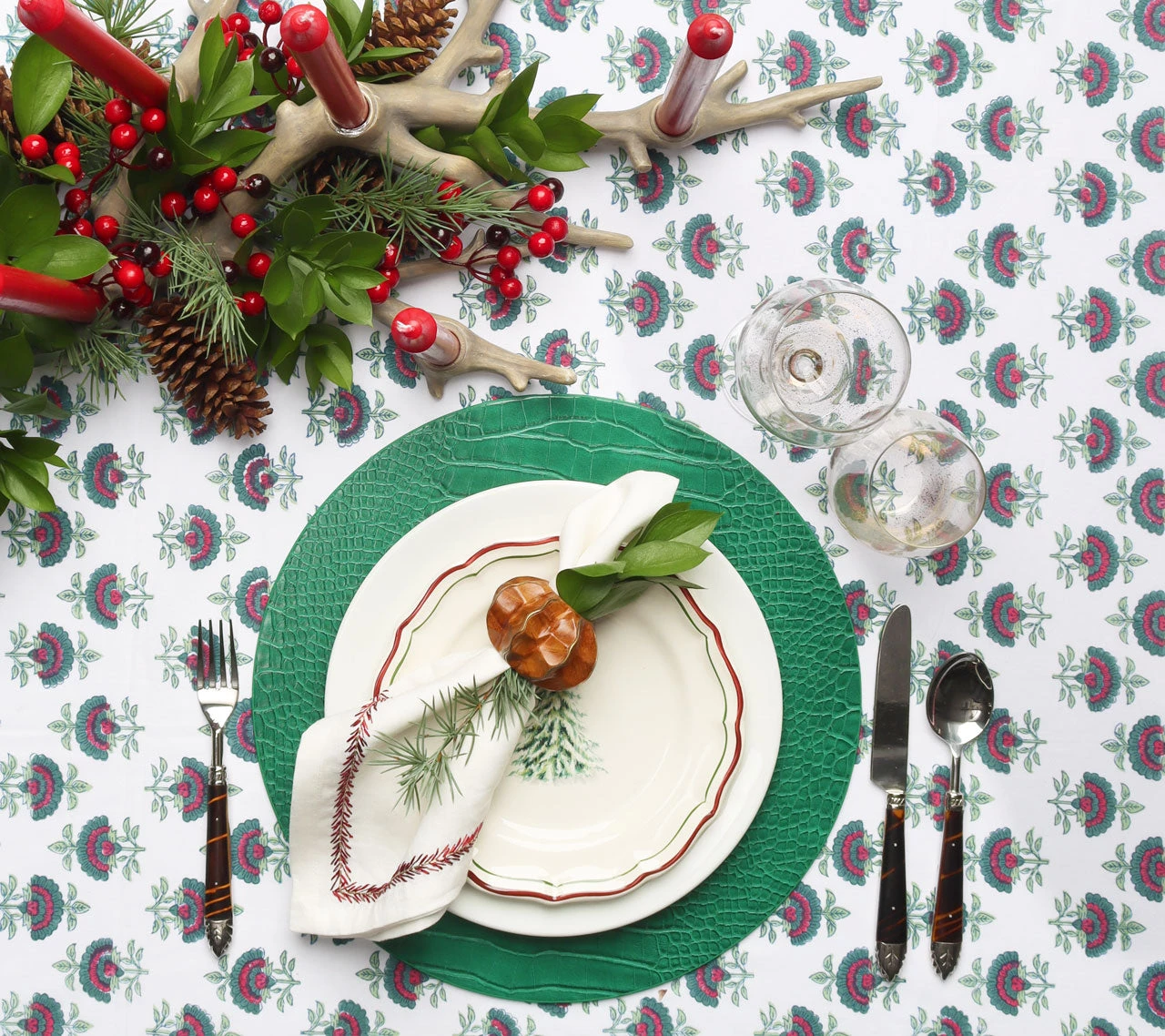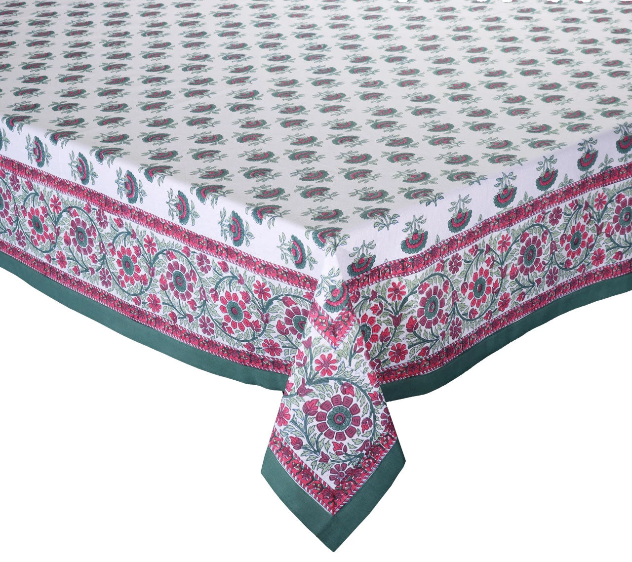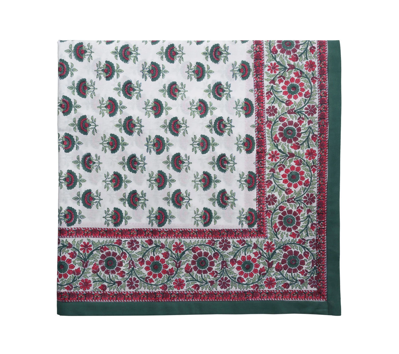 Inspired by the delicate formation of Zinnia petals, the Zinnia Tablecloth features a crisp repeating pattern surrounded by a rich floral border. The ancient block printing technique is used to hand-print different repeating red, white, and green designs on the Zinnia Tablecloth. A stunning addition to any table, this tablecloth sets the stage for a luxurious occasion.