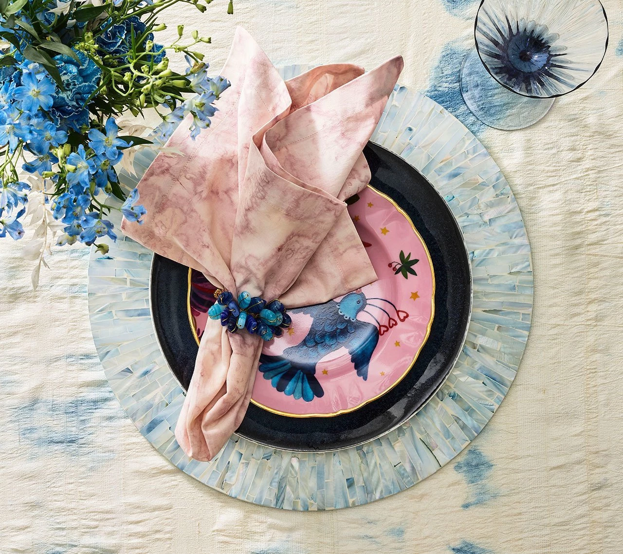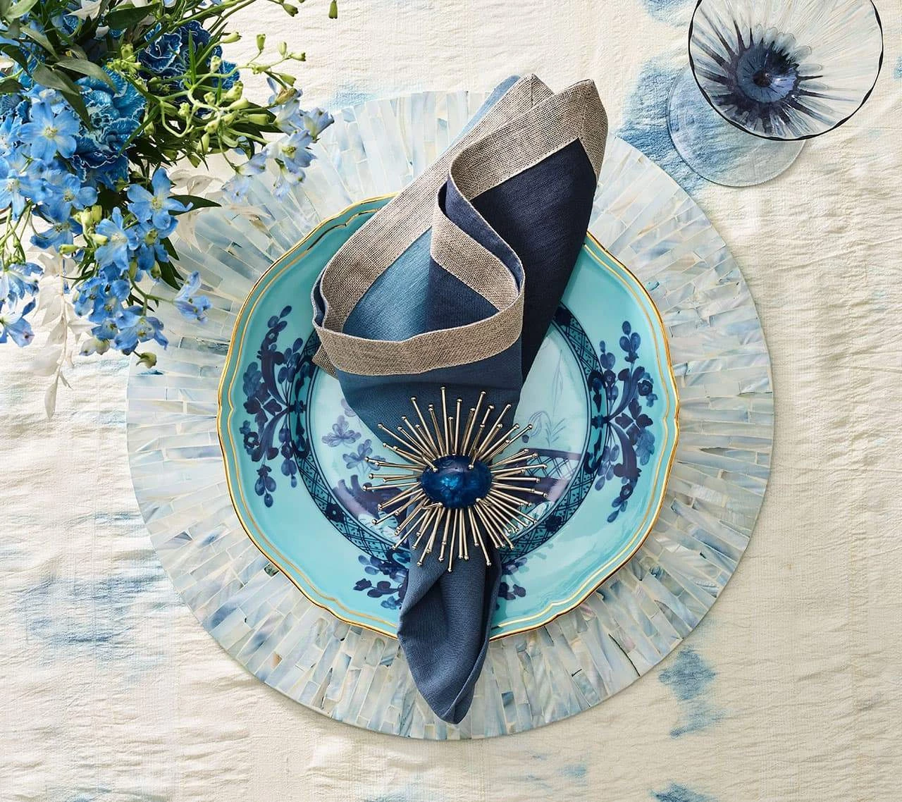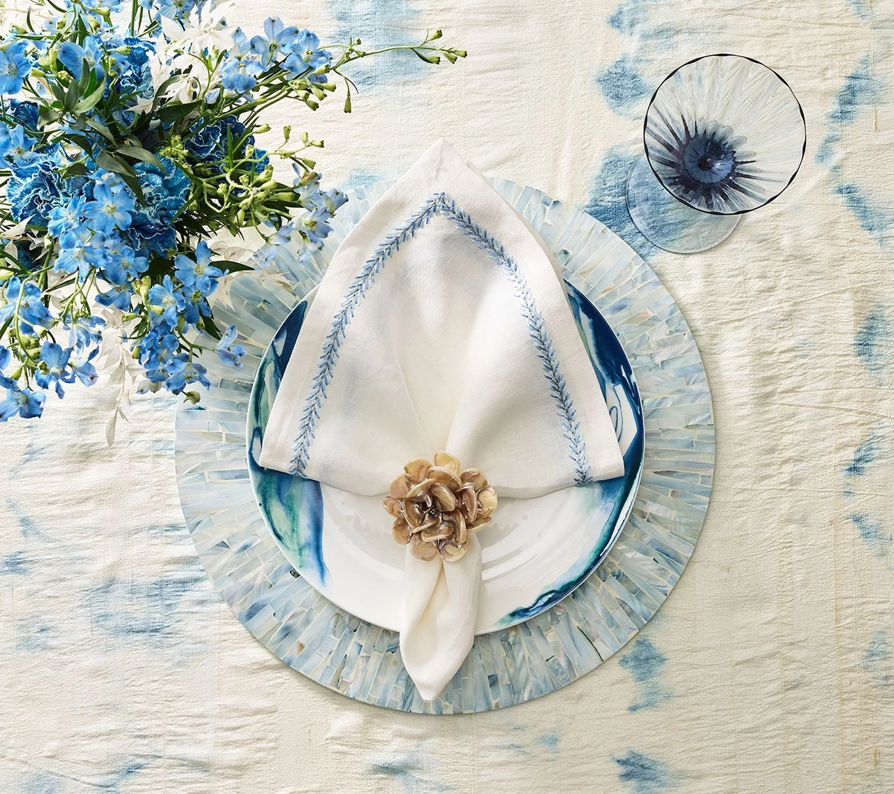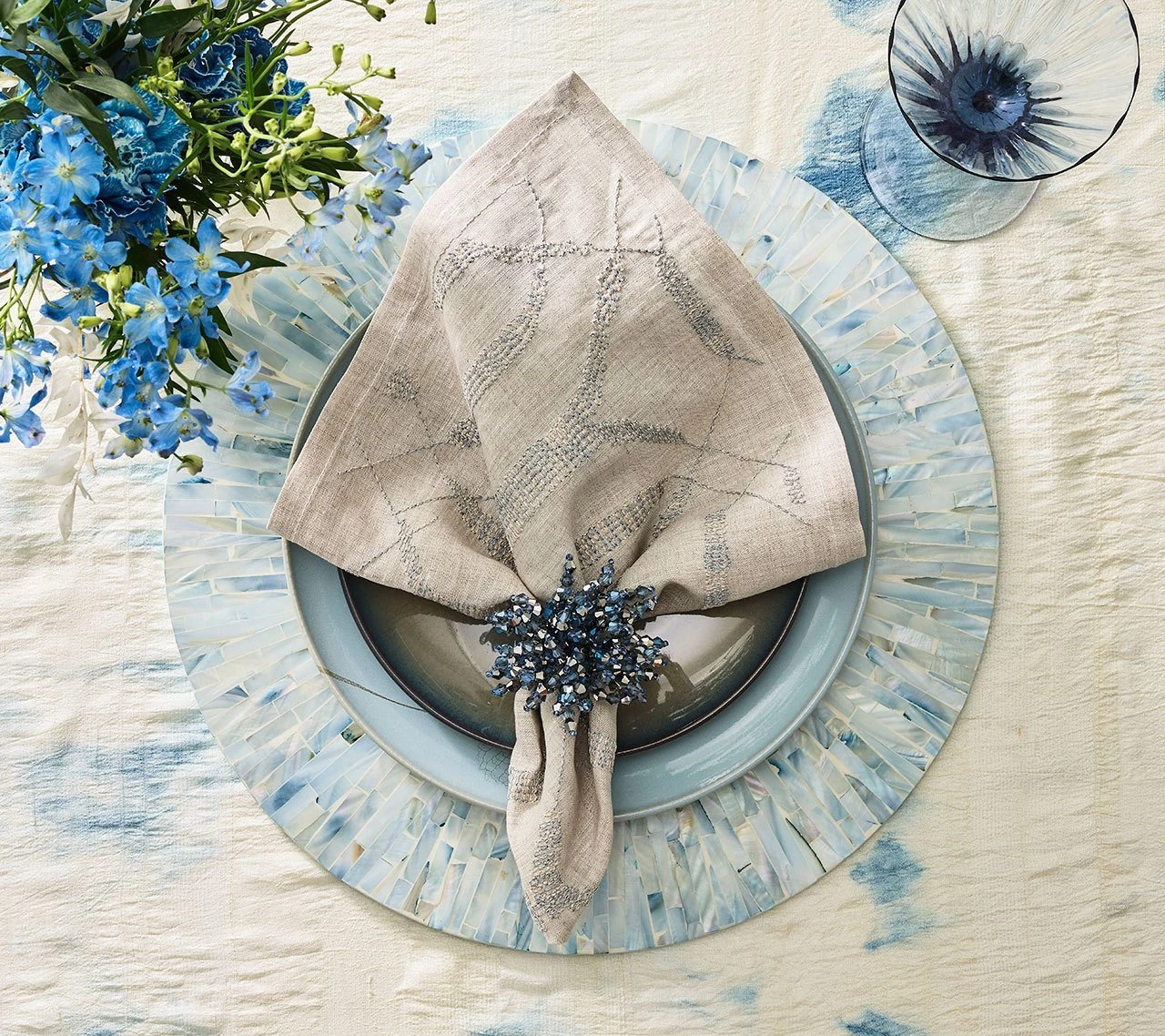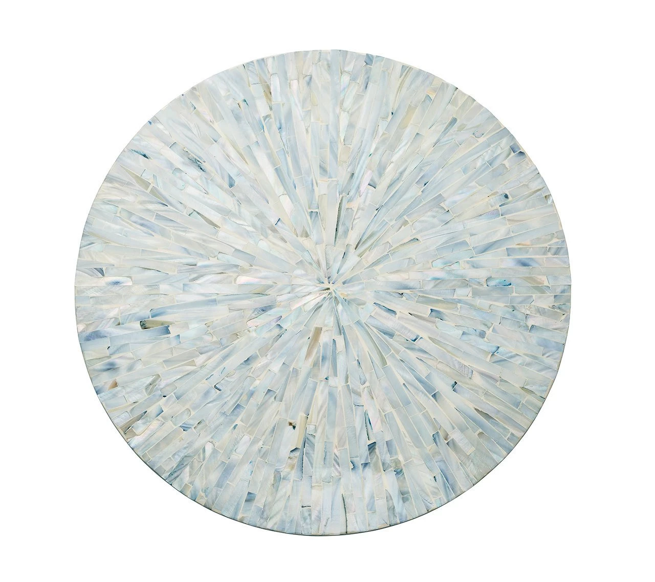 Tahiti, French Polynesia’s largest and most diverse island, is known for its tranquil ocean waters and host of serene lagoons. Evocative of this soothing atmosphere, the Tahiti Collection features natural materials arranged in a fluid style. Rare mother of pearl pieces are hand-dyed a soft blue & periwinkle hue and hand cut to achieve an artisanal look.