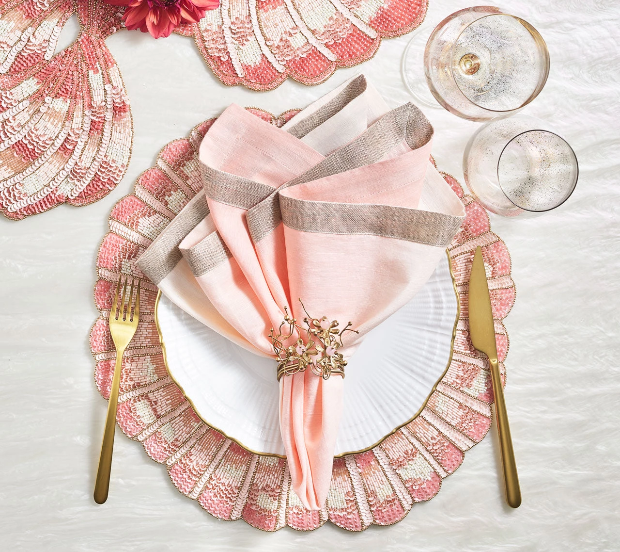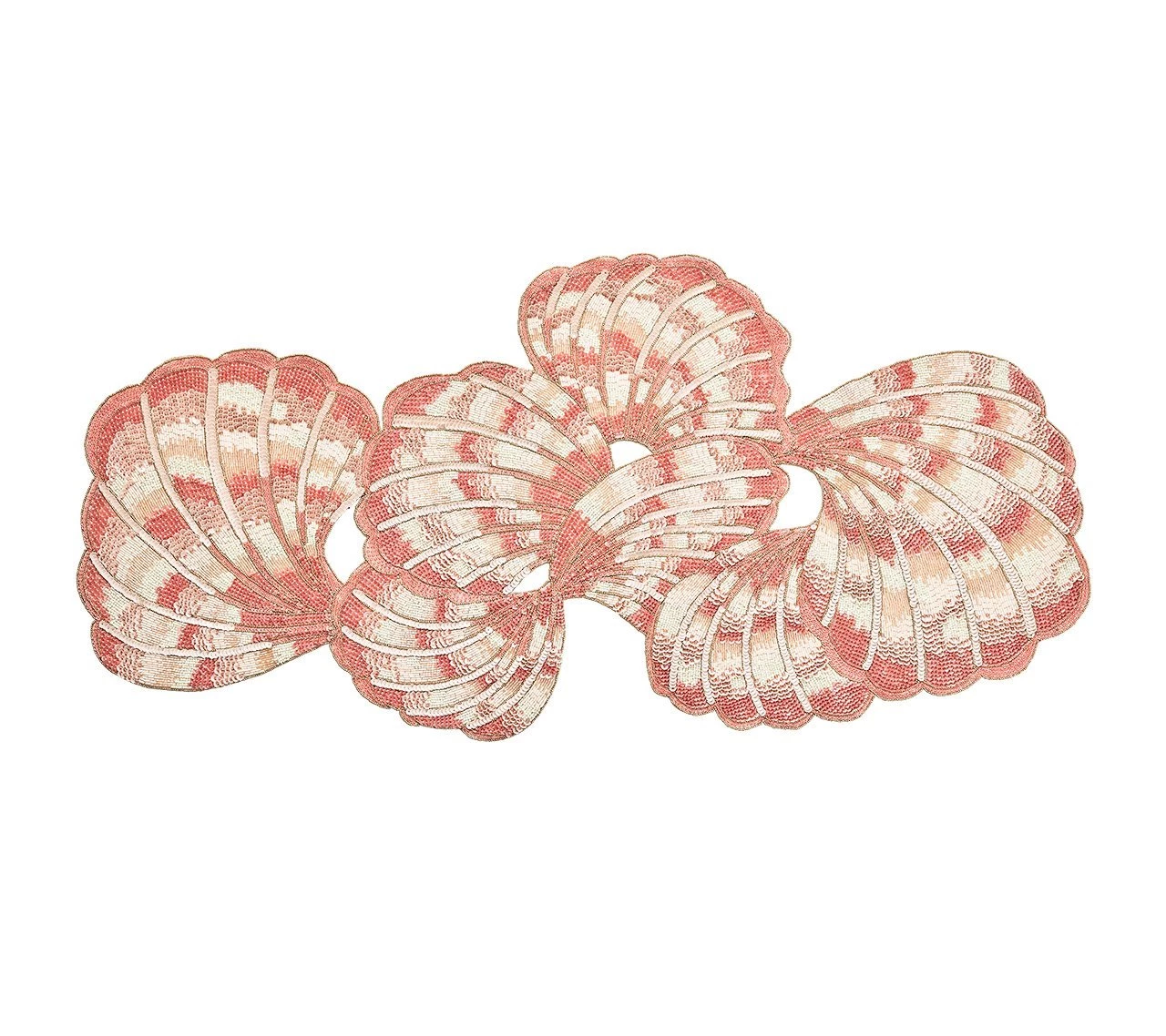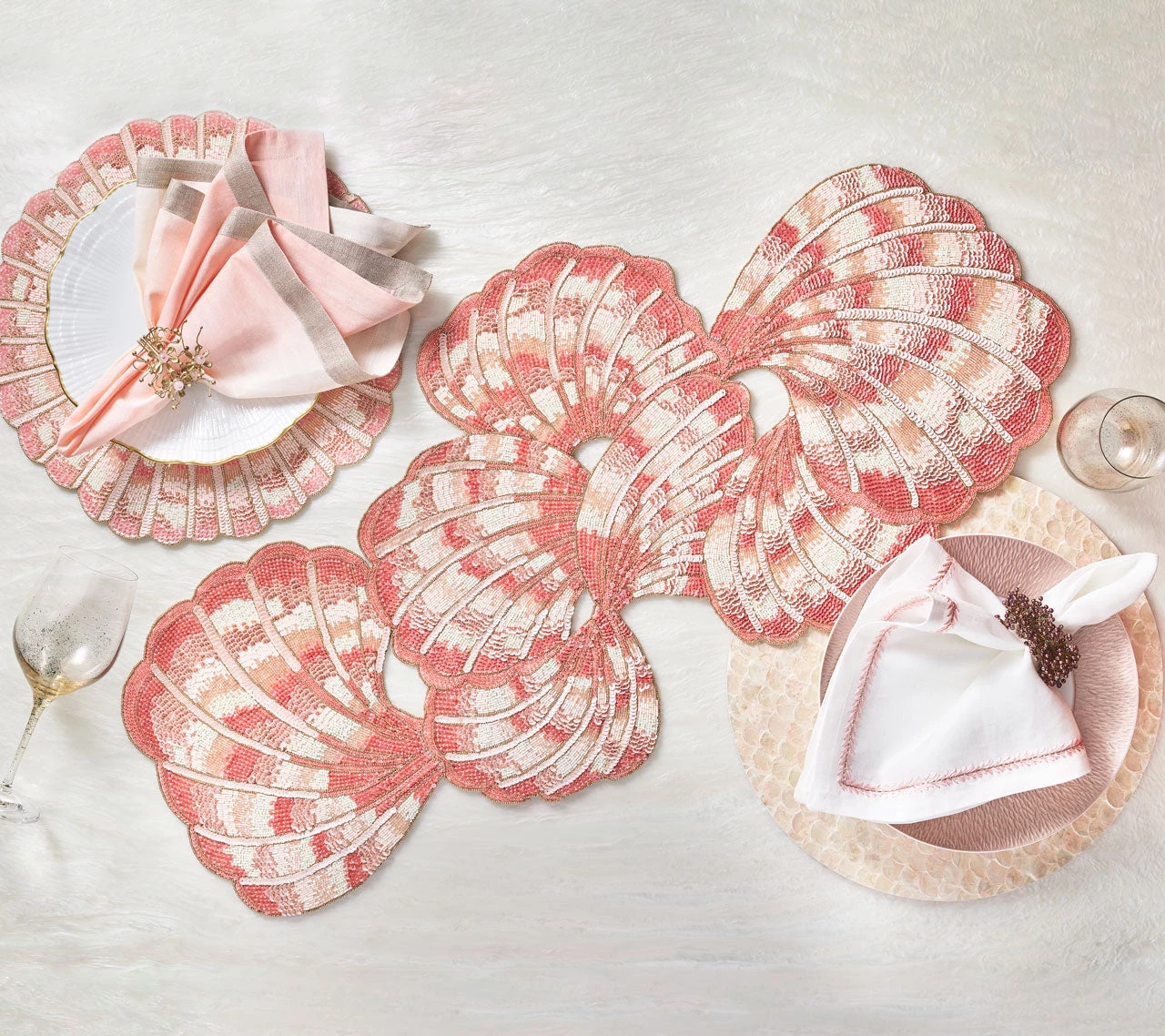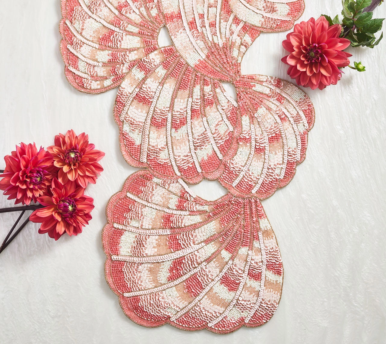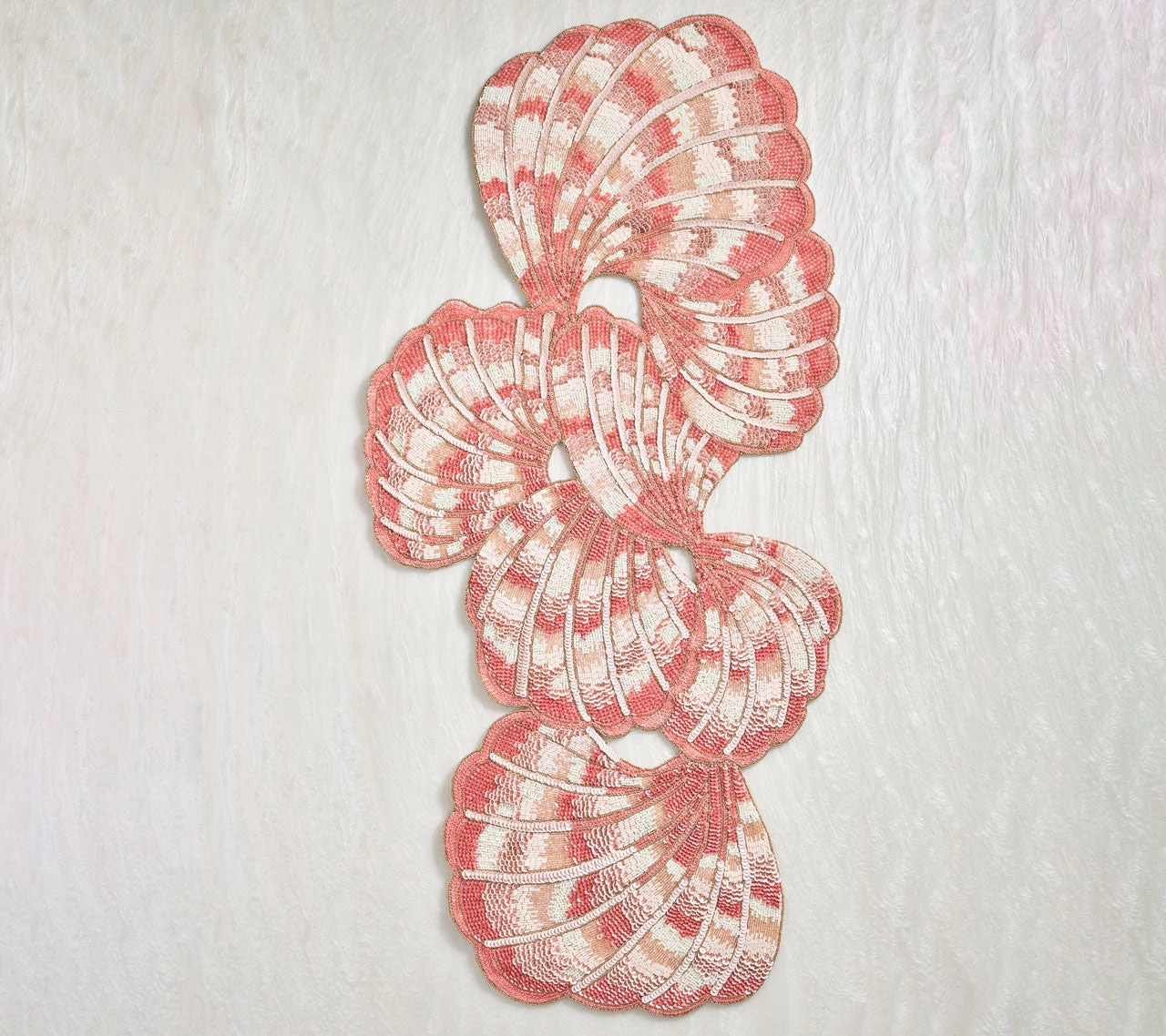 Inspired by majestic shapes found deep within the sea, the hand-beaded Triton Runner features gorgeous coral and blush tones and scallop details. A variety of glass and acrylic beads and sequins create a stunning ombre effect on the Triton Runner.