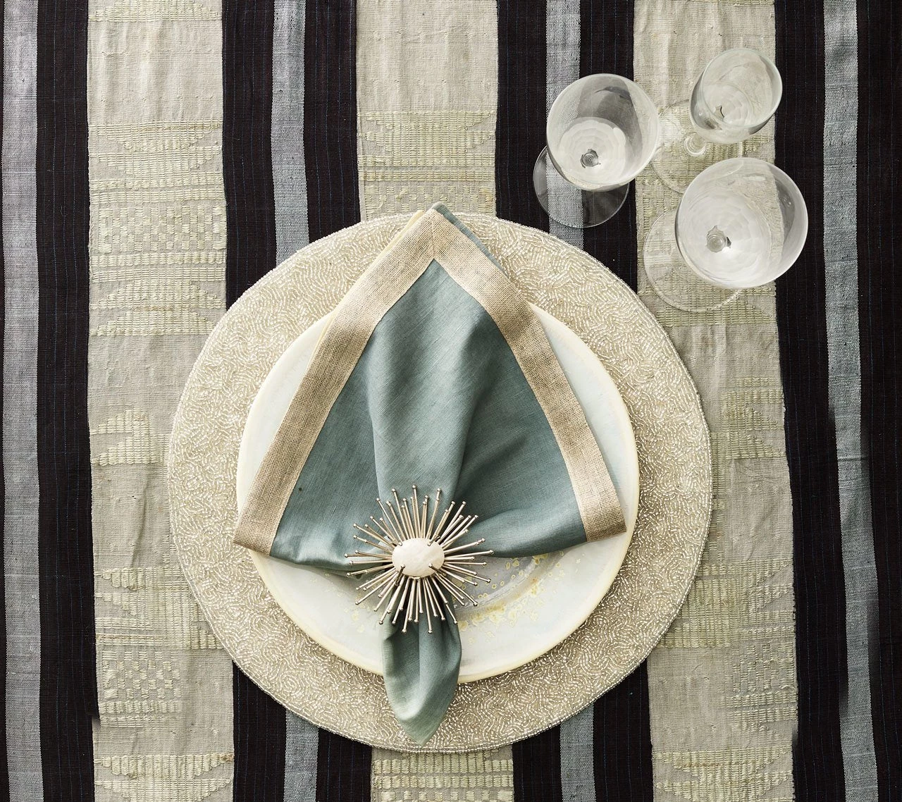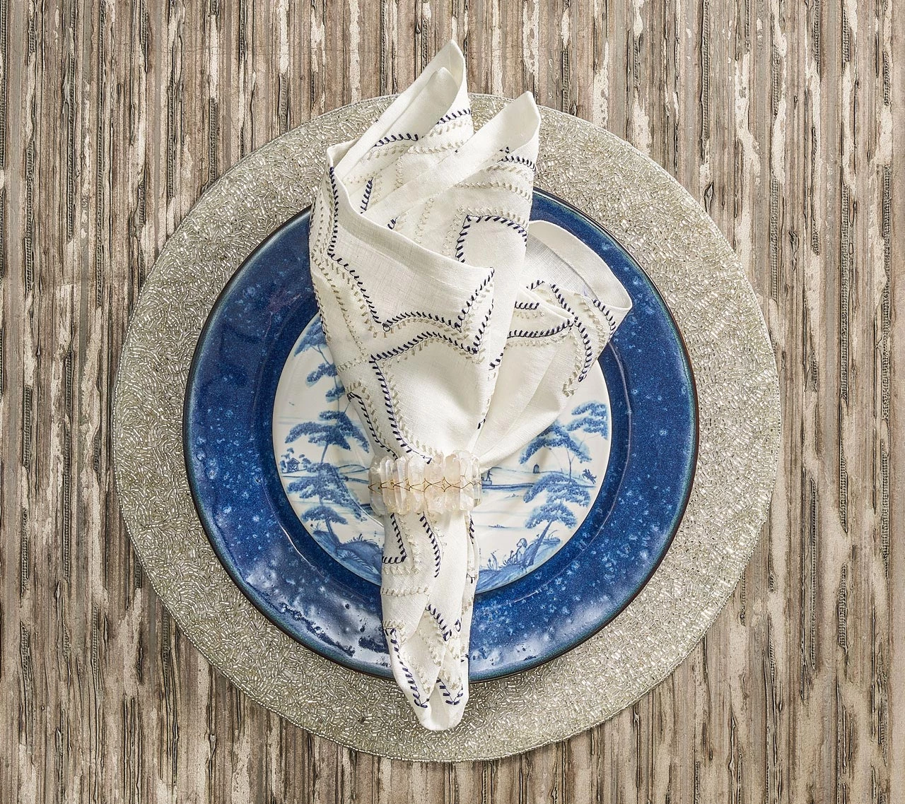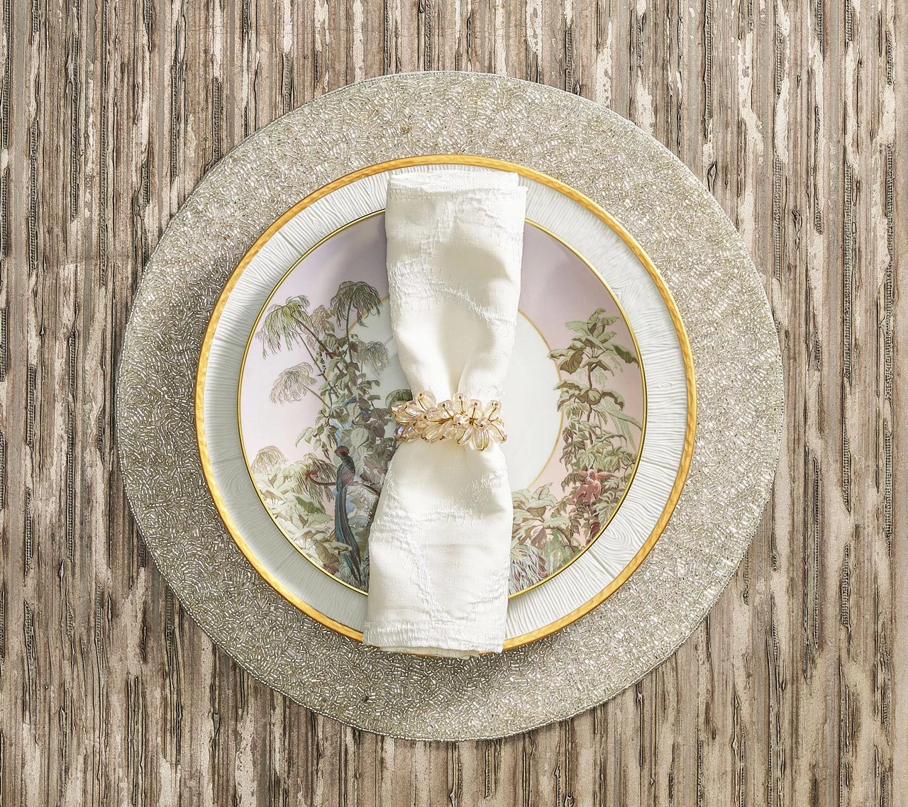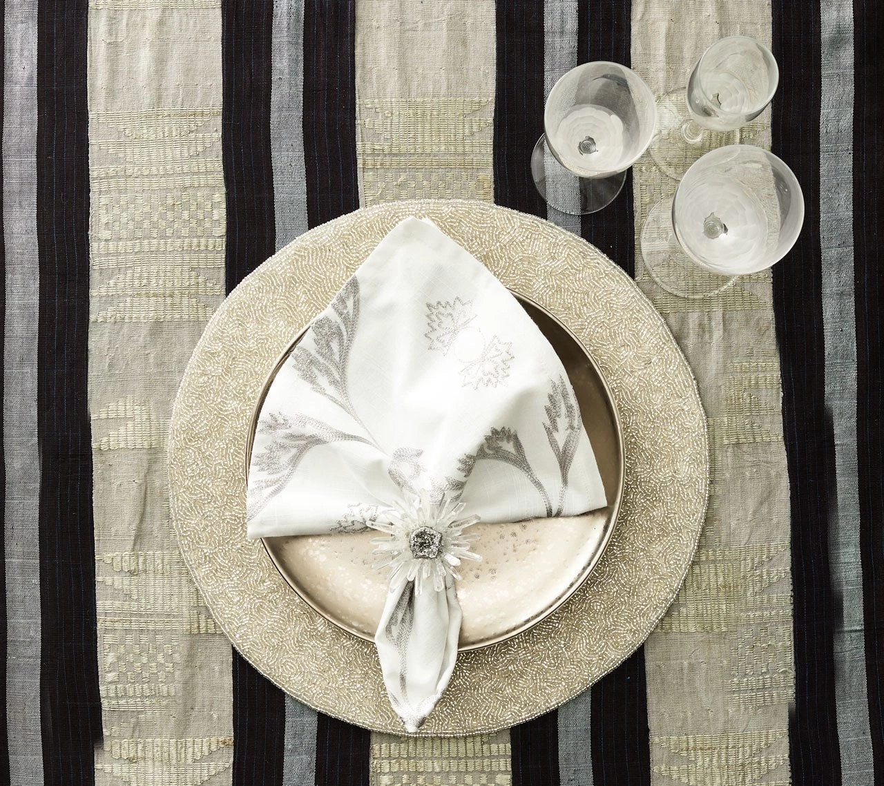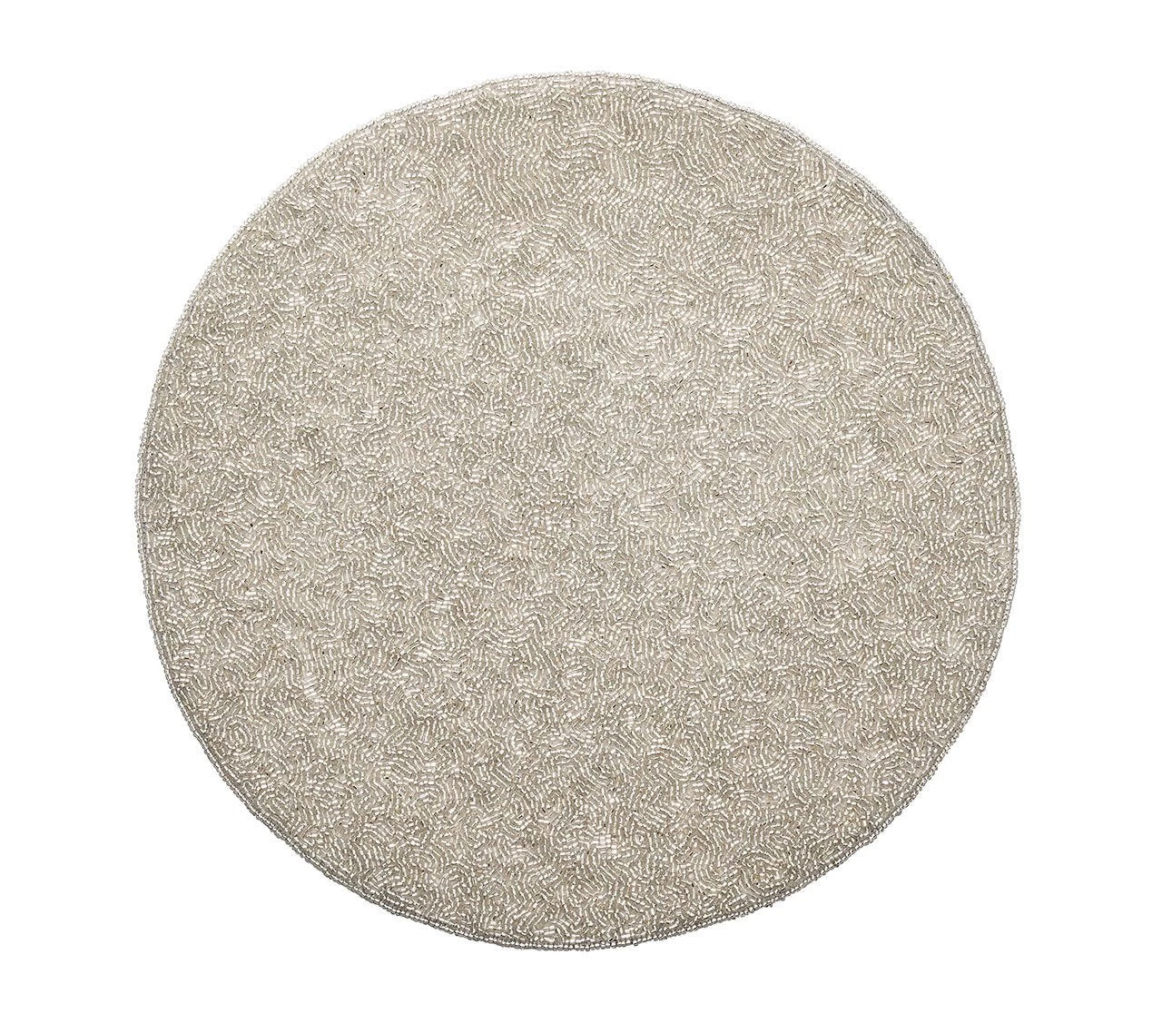 Named for a traditional style of beading, the round, beaded Vermicelli Placement is hand-beaded with incredible attention to detail. Customarily a circular design, this beaded stitch is an elevated technique and translates beautifully as an adornment for the table. The silver, beaded, round placemat adds a touch of sparkle to a quiet dinner or enhances an already festive table.