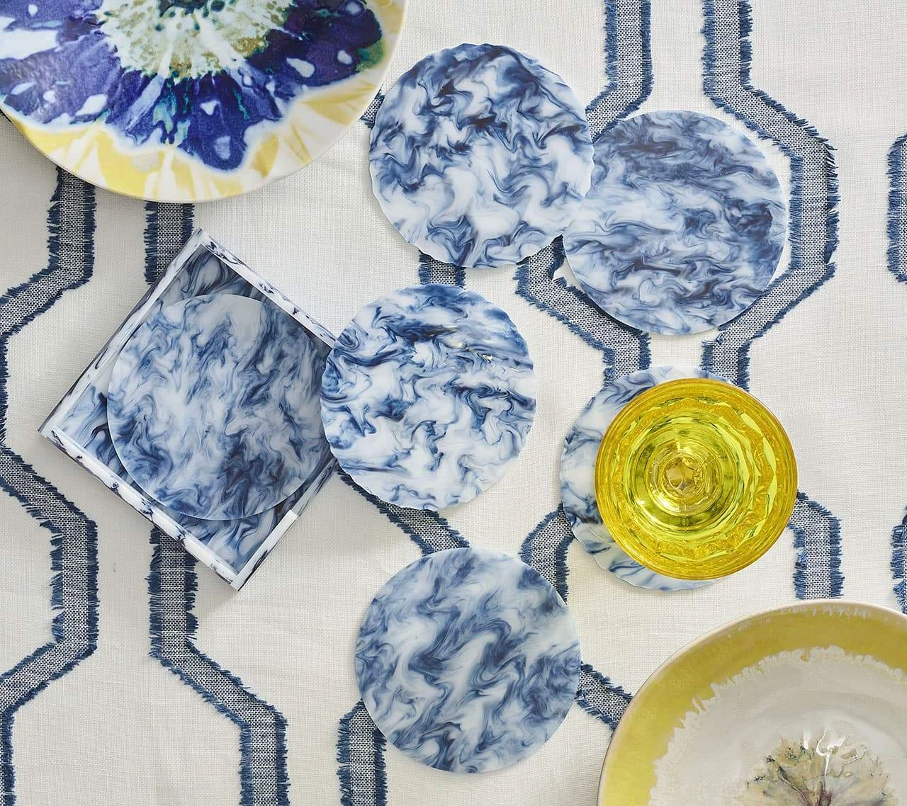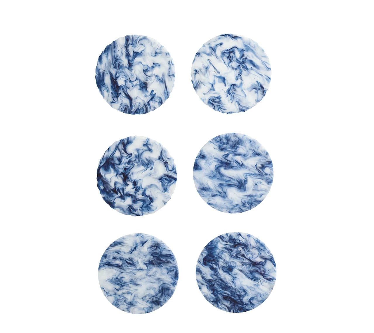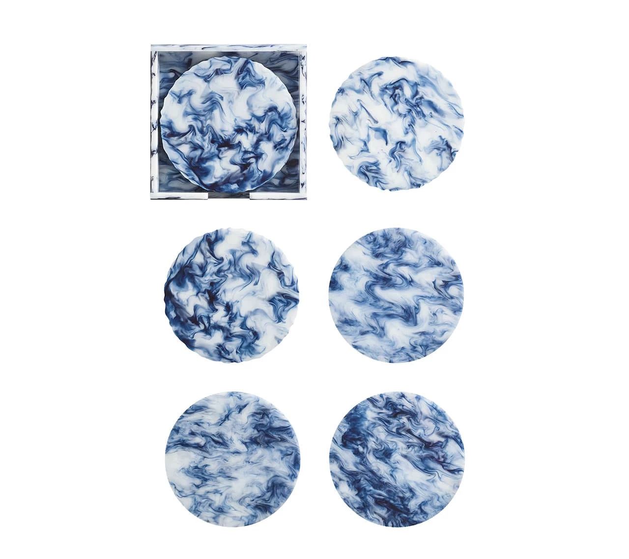 The round Waves Drink Coasters are an abstract take on the rhythmic movement of the ocean. The round Waves Drink Coasters feature white and blue turns and swirls formed by hand-poured resin. Edges of the round acrylic drink coasters have curvy cuts mimicking the crest of a wave. The set of six drink coasters are packed in a gift caddy.