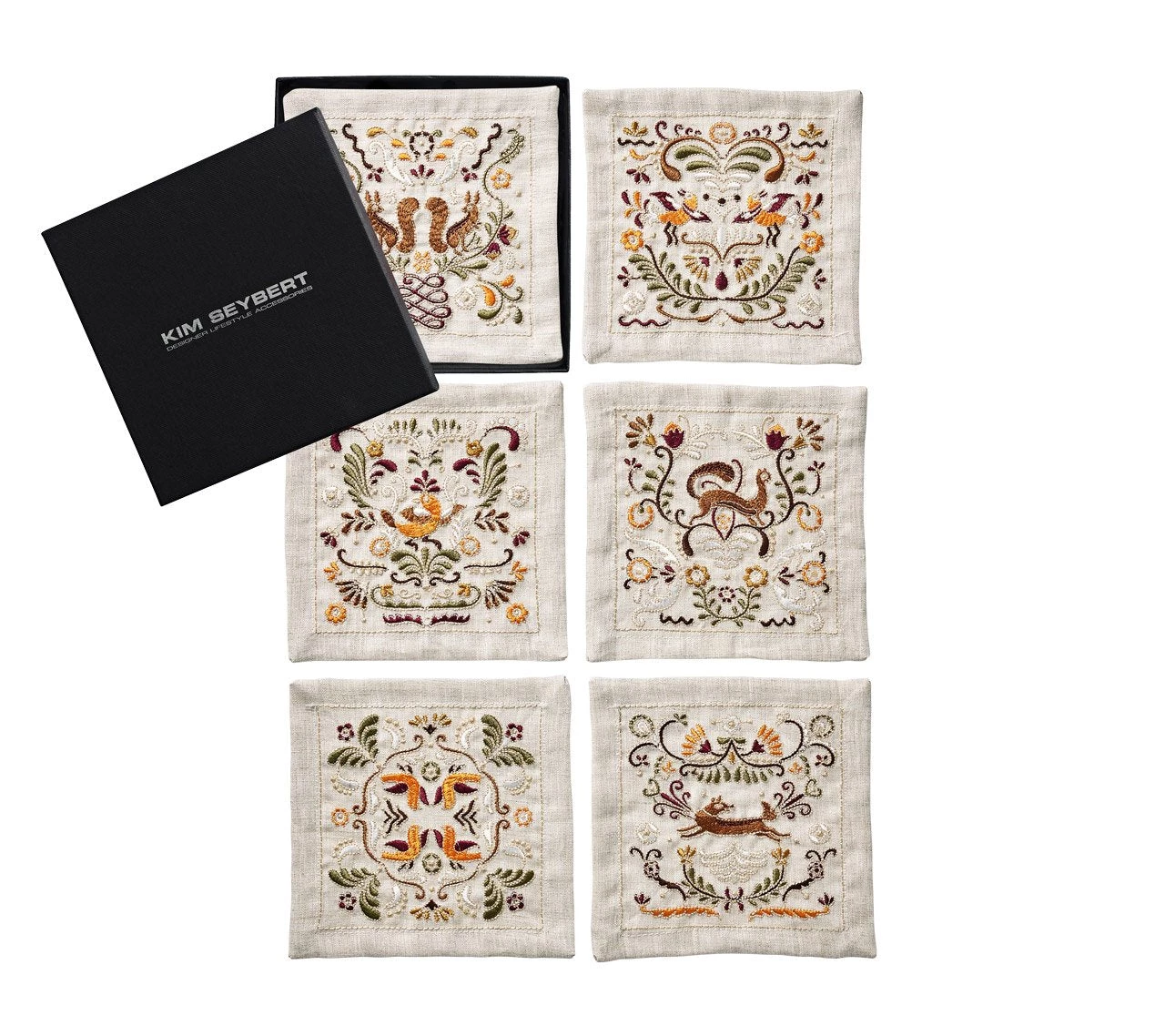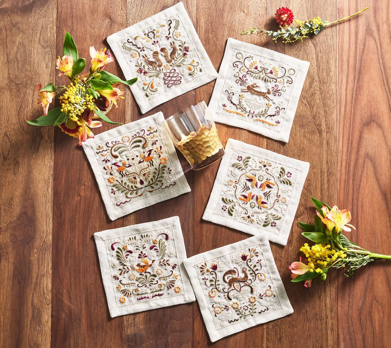 Inspired by folkloric woodland scenes, the Woodland Cocktail Napkins feature embroidered animals surrounded by ornamental details. The autumnal colors of the hand-drawn imagery pop against the natural linen napkin. These cocktail napkins are the perfect addition to any fall soiree.Â