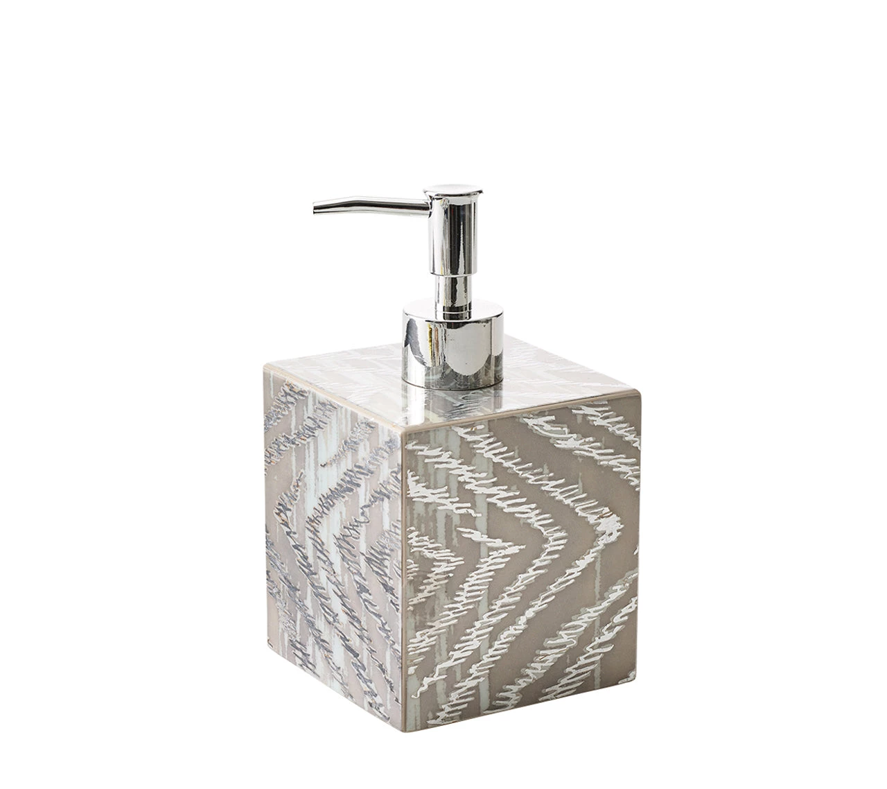 We have re-interpreted classic zebra pattern on our newest bath collection. Instead of the traditional black and white color combination, we washed it in metallic silver and gray. They are made by hand using lacquer techniques and metallic foiling. The result is a modern must-have bath set, especially this soap dispenser.